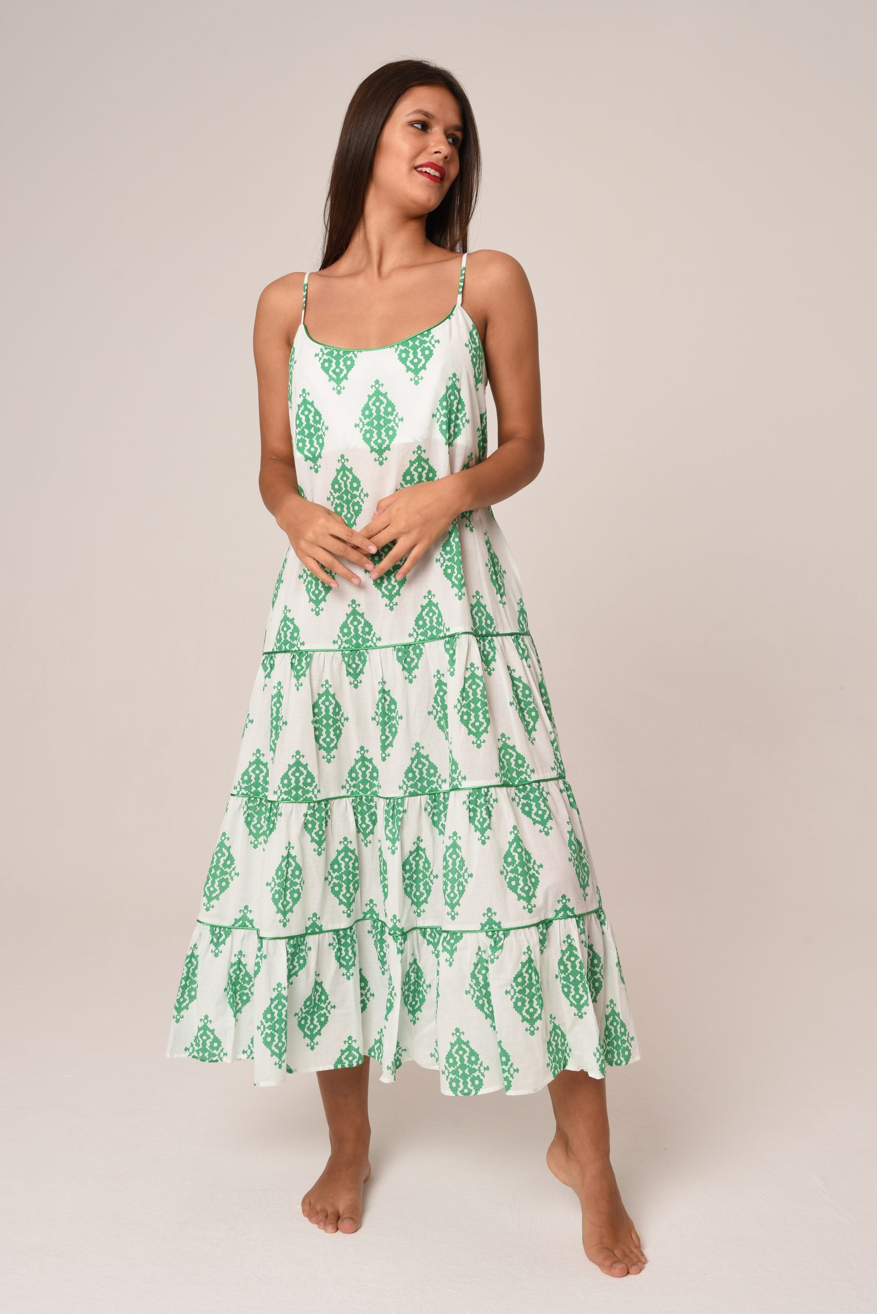 BEYAZ ÜZERİNE YEŞİL DESENLİ, ASKILI , PAMUKLU KUMAŞ.